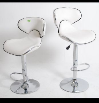 A group of 4 20th century retro chrome bar / kitchen stools with white seat pads in the manner of Dwell. Measures: 94cms high x 43cms wide x 50cms deep.