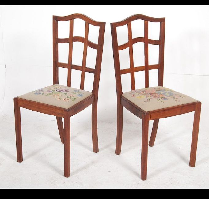 A rare pair of original Welsh Brynmawr vintage Art Deco mahogany lattice back dining chairs having crochet woven seat pads. each chair with original Brynmawr makers badge. Designed by Paul Matt. Measures: 98cms high x 45cms wide x 45cms deep.