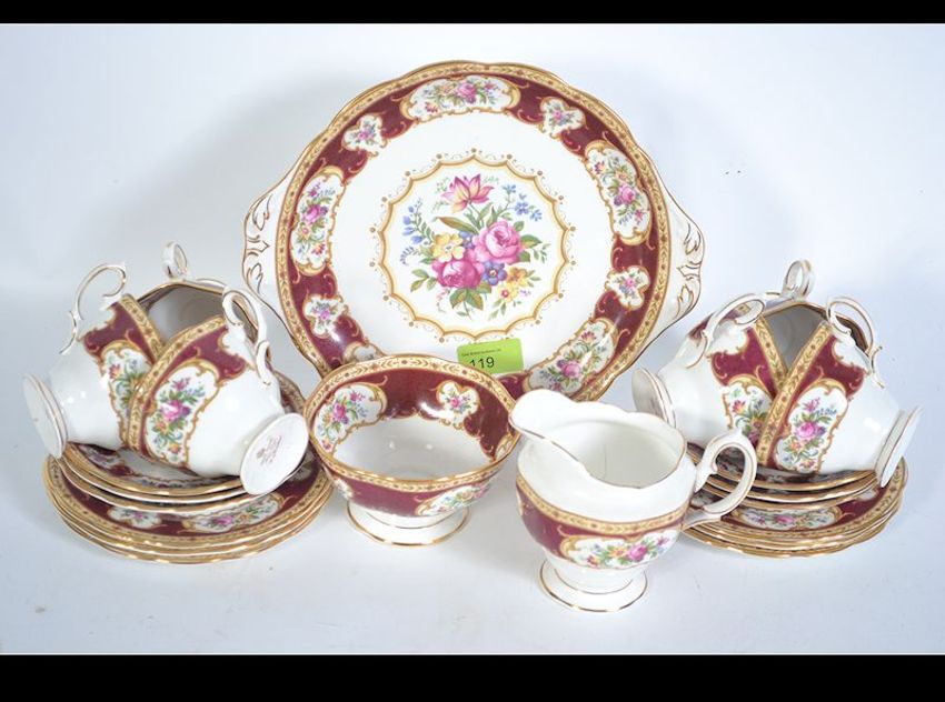 A six person China tea service by Royal Albert in the ' Lady Hamilton ' pattern. Comprising of six trio's, sugar bowl, milk jug, cake plate etc.