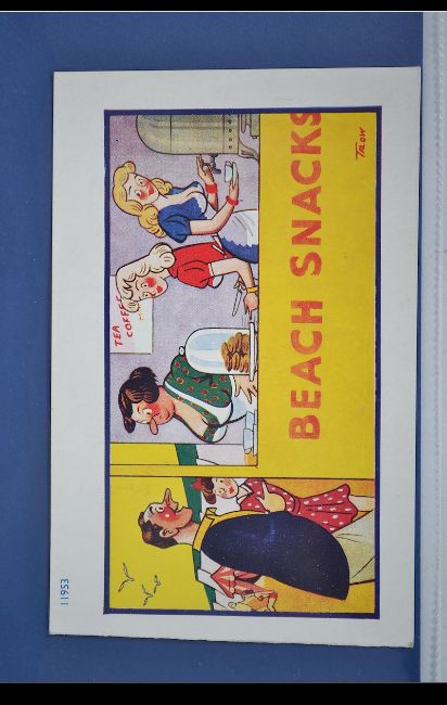 Saucy seaside comic postcard with major error: INSCRIPTION OMITTED. Artist: Trow. Publisher:Richter. #11953. Shows Beach Snack bar with two blonde servers and customer asking for hot crumpets. With normal for comparison. Unusual / rare variety for a postcard.