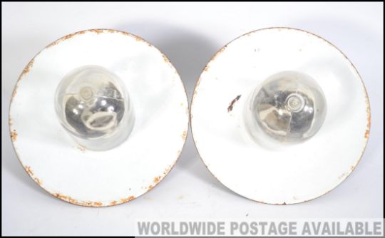 A pair of vintage mid century dairy lamps having glass bulbs set to black and white enamel painted metal saucer shades. Measures: 24cms high.