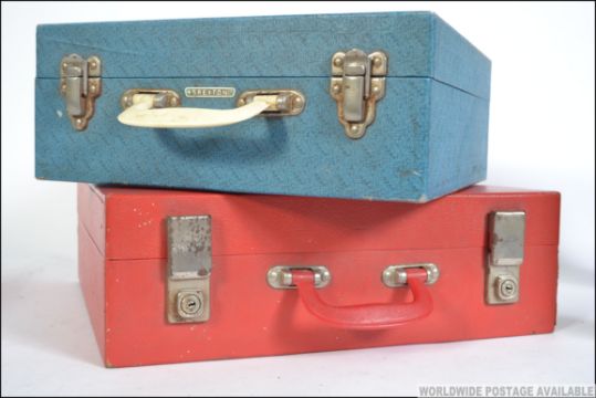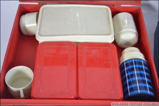 2 vintage 1960's vintage Brexton picnic hampers, one in blue and one in red having appointed interiors