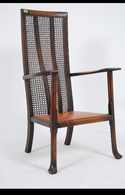 An early 20th century Arts & Crafts beechwood high back bergere high back chair with scalloped lumber support . Reminiscent of William Morris with Charles Rennie Mckintosh influences. Measures: 111cms high x 60cms wide x 60cms deep.