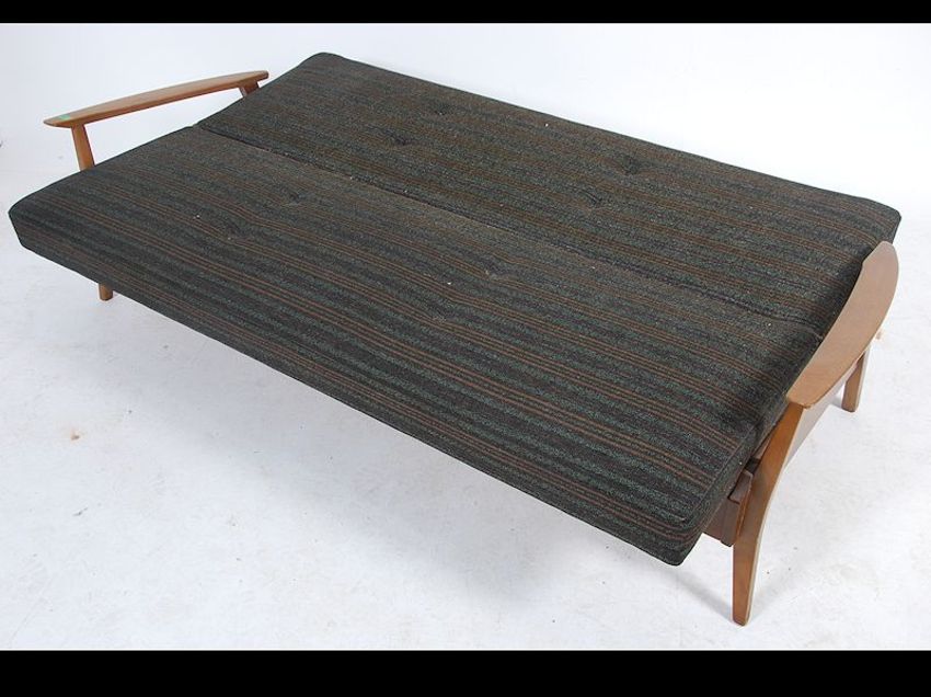A 1960's Danish inspired sofa day bed with the original upholstered seat/ bed being raised on tapering legs with sloped elbow supports. Measures: 86cms high x 200cms wide x 90cms deep.