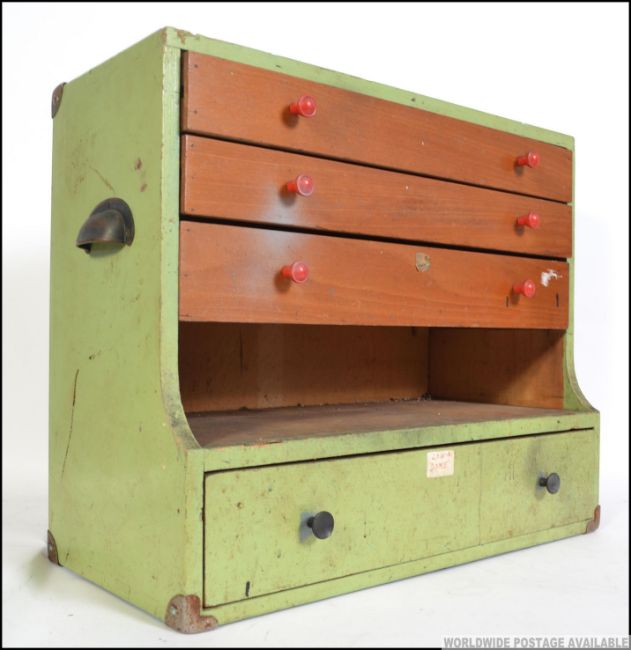 A mid 20th century painted workmans wooden toolbox, having a run of three drawers brass carry handles to the side. Measures: 55cmw wide.