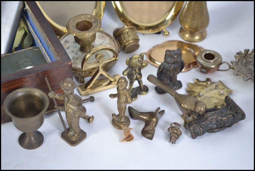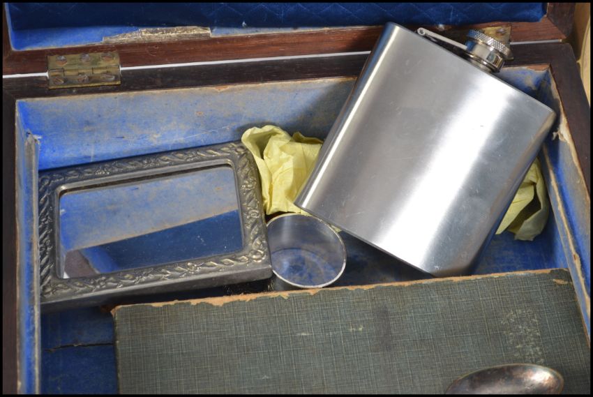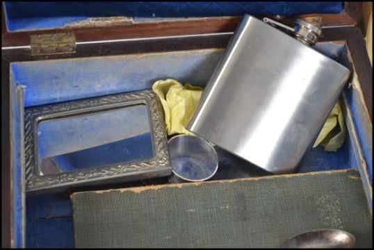 A collection of items to include silver plated napkin rings by Arthur price, flatware, hip flask, brass wares to include picture frames etc please see images. Box measures 28cms wide.