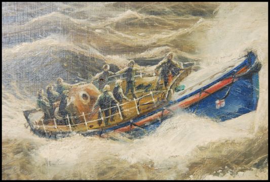 G Butten 1976. An oil on board painting of a lifeboat rescuing sailors from a partially sunk tall ship in rough seas. Signed to corner and framed