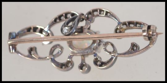 A Victorian Art Nouveau 9ct gold and silver diamond and opal brooch having an articulating pendant. Measures 4cms. Total weight 4.5g. Tests 9ct gold and silver.