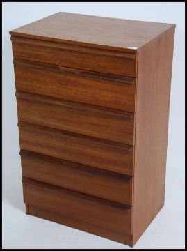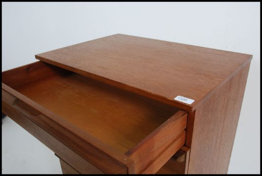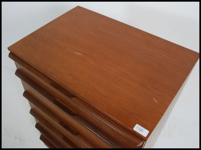 A 1970's teak wood Danish influence pedestal chest of drawers being raised on an inset plinth with upright bank of drawers having shaped handles to each drawer. Measures: 97cms high x 62cms wide x 45cms deep.