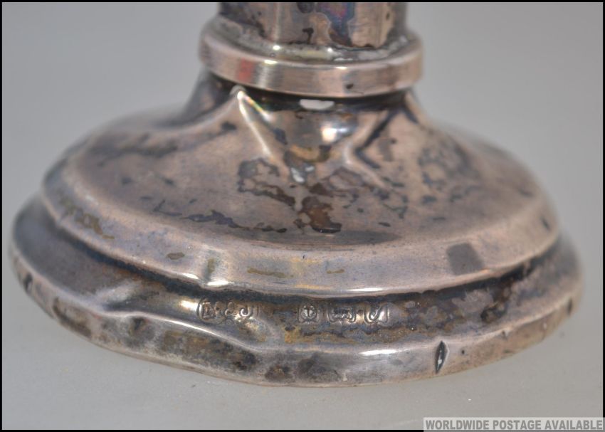 A near pair of silver filled stub stub candle sticks along with a silver capstan ink well. Measures: 9cms tall.