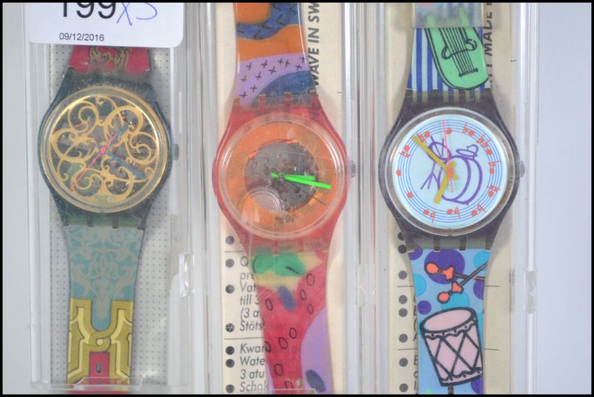 A group of three cased collectors Swatch watches of different designs retaining paperwork and cases.