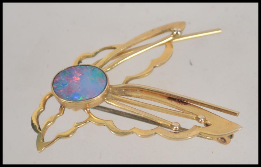 A 9ct gold and opal ladies brooch in the form of a dragonfly. Stamped to verso with roll over clasp pin. Total weight 3.3g
