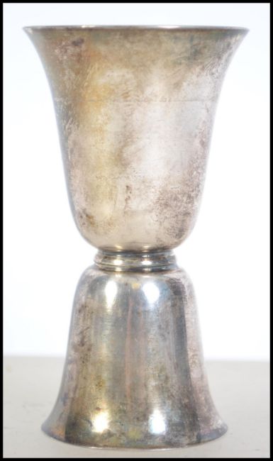 A sterling silver drinks measure jigger with makers mark SP and figural head mark to inside. 9cms high