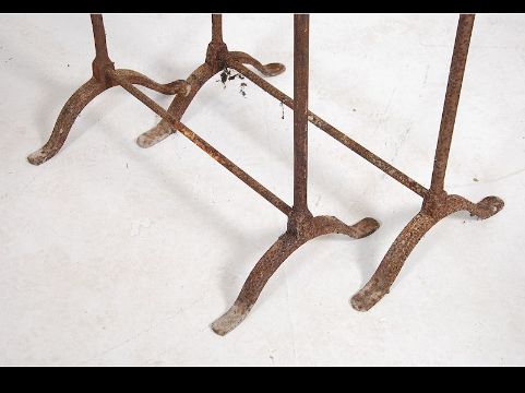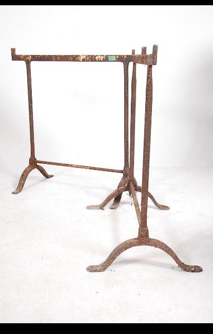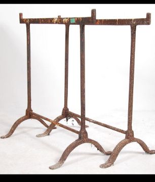 A pair of vintage early 20th century cast iron workmens trestles with swept supports ideal for conversion to table. Measures: 32cms high x 92cms wide x 54cms deep.