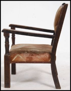 A 1930's childs chair of beech wood construction having shaped elbow rests on squared legs. Measures: 55cms high x 41cms wide x 42cms deep.