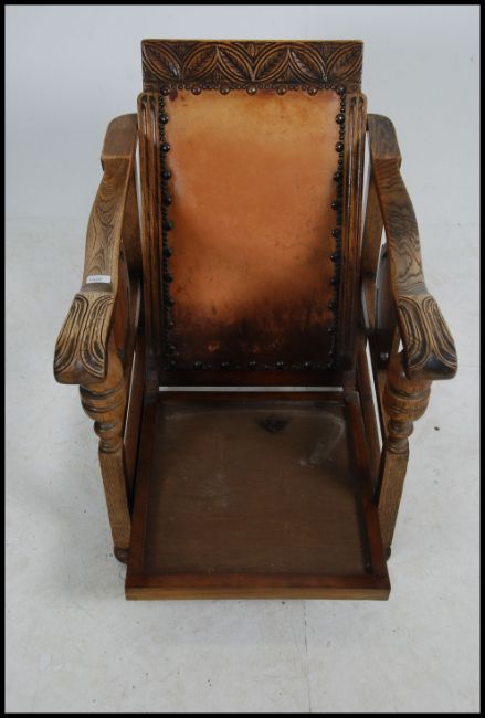 A 1930's Art Deco fireside armchair being made for an Interiors exhibition in London. The chair with tan leather back having chintz cushion with shaped elbow rests. Measures 84cms high x 58cms wide x 69cms deep.