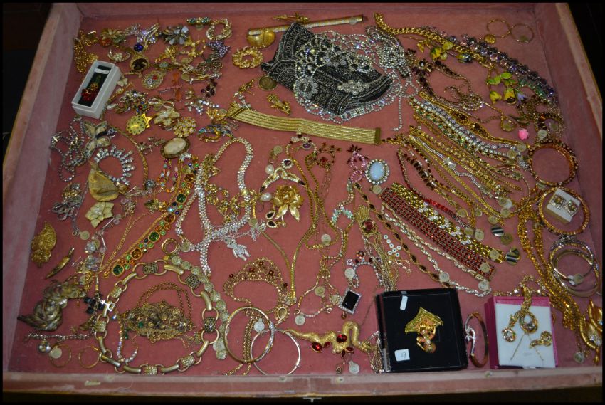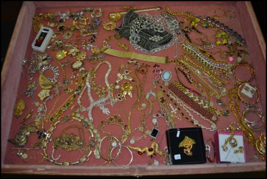 An extensive collection of costume jewellery to include brooches, bracelets, bangles etc. Large snake brooch, flower enamel brooch, heart pendant, belcher chains, dragonfly brooch, Arabian brooch, micro mosaic, millefiori and many others