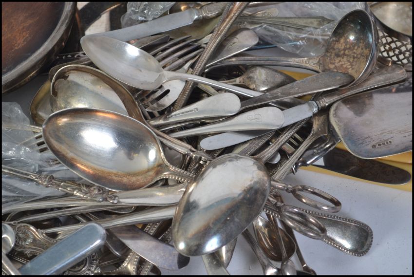 A collection of silver plate wares and flatwares to include pierced rectangular salver, teapot, mats, ashtray, centrepiece. Flatwares to include cutlery by Mappin & Webb and others etc