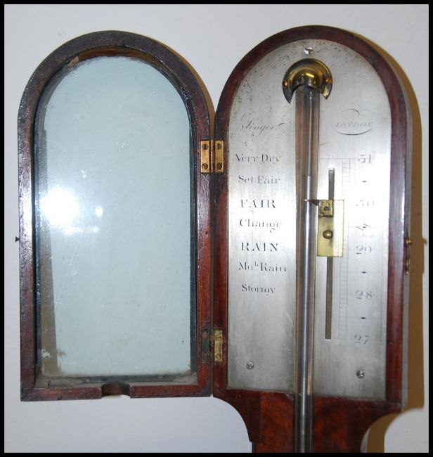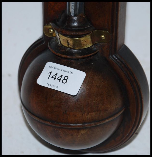A 19th century Georgian mahogany stick barometer. The silvered barometer dial marked for Singers of London flanking brass adjustment. Cup and cover base with mercury barometer centre