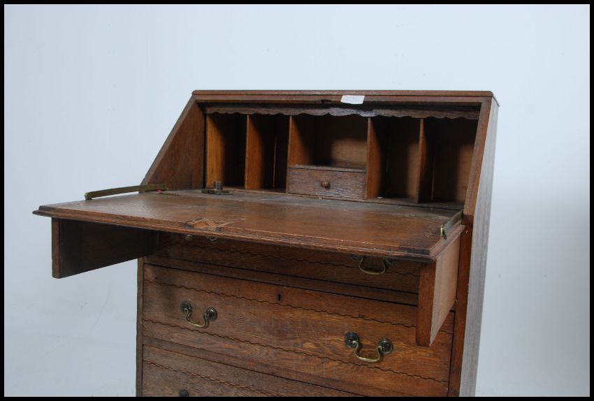A 1920's Arts & Crafts oak bureau having fall front slope with appointed interior set within and with chest beneath. Measures: 100cms high x 76cms wide x 42cms deep.