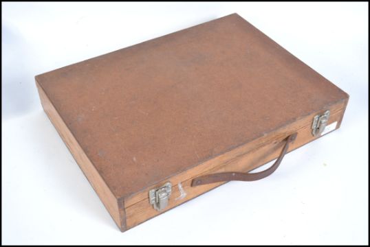 A 20th cenutry wooden cased artists box containing many accessories to i include paints, brushes etc. Measures 48cms wide.