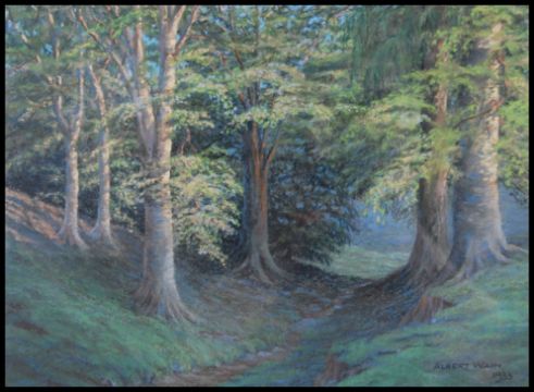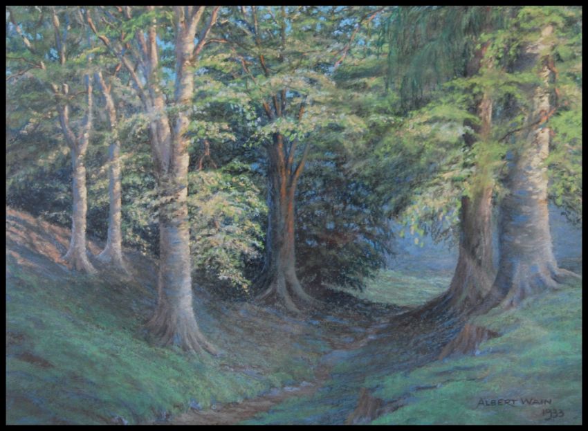Alaistair Wain 1933. A pastel painting of a woodland path surrounded by trees. Framed and glazed being signed by the artist.
