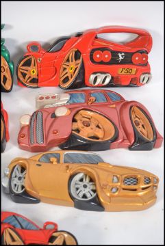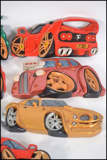 A collection of 7 hand carved and painted wooden wall plaques of vehicles to include Ferrari, rally cars, Police Car, Hot Rod, Subaru etc. Beautifully carved by M. Williams of Newport being part of an extensive collection of wooden crafts, figures and models in this sale. Measures 28cms wide.