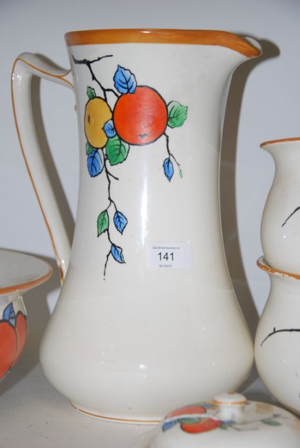 A 1930's Crown Ducal ceramic bathroom set comprising jug and bowl, chamber pot and other items all with transfer print floral spray design being stamped to the base