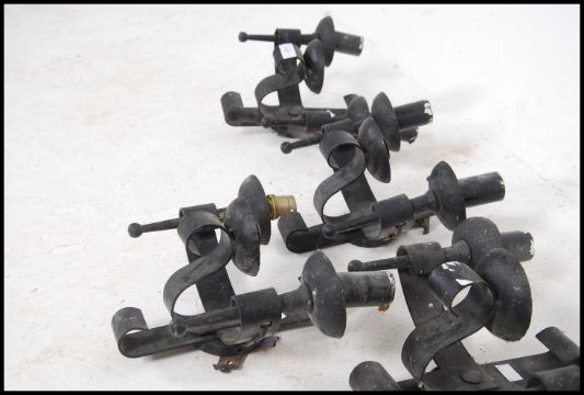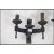 A collection of medieval style strap metal twin head wall lights, The cast metal straps with black painted finish
