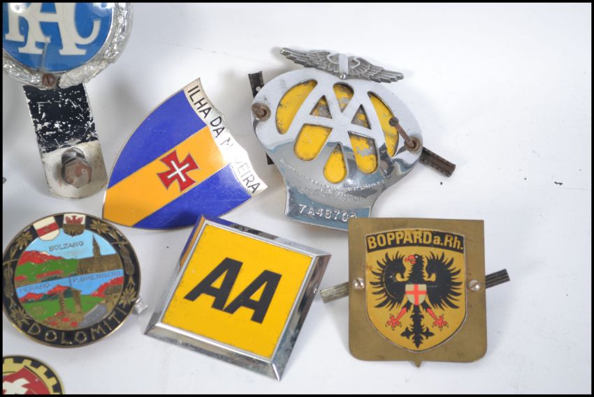 A Collection of motoring related items to include a rare moped 1950's Iron Cross wing mirror. Together RAC and AA badges, continental town coat of arms etc