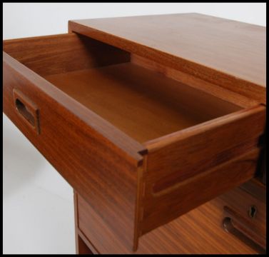 A superb 1960's Danish influence teak wood sideboard cabinet raised on squared legs having a thin body, wide and tall body comprising drawers and cupboards with fall front body etc. Measures: 122cms high x 137cms wide x 36cms deep.