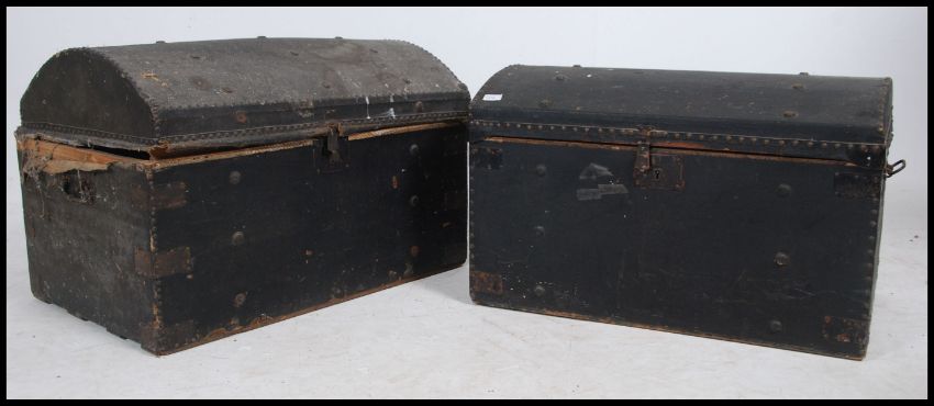 2 Victorian wooden and leather dome top travel trunk chests. Both with lined interiors with carry handles to the sides ( one lid loose )