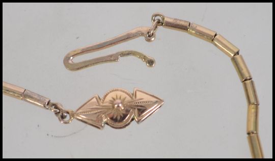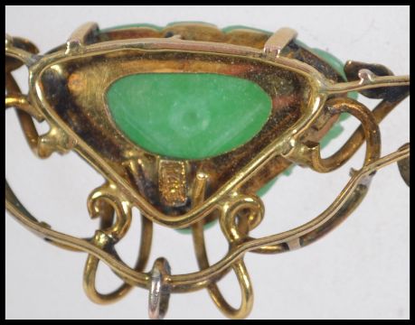 A vintage 14 ct gold and jade necklace with carved jade panels set within a foliate mount having a stylized hook clasp. Measures 17 inches. Total weight 26g. Marked 14ct tests 14 ct gold.