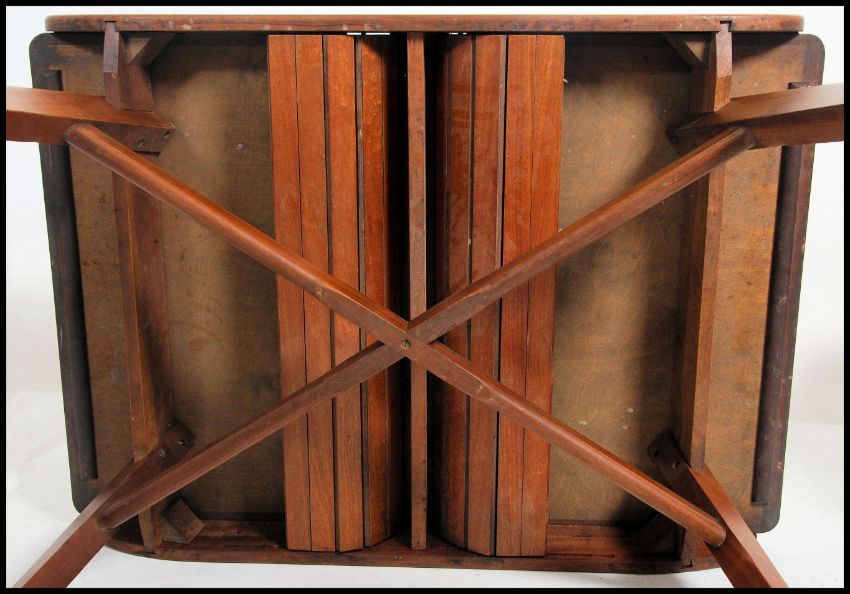 A 1950's vintage roll top / tambour leaf walnut dining table and chairs - suite. The unusual table raised on tapering angled legs with a rectangular table top having a roll tambour leaf to centre. Matching set of 4 dining chairs also available. Matching sideboard also available in lot 1141. Measures: 76cms high x 107cms wide x 77cms deep.