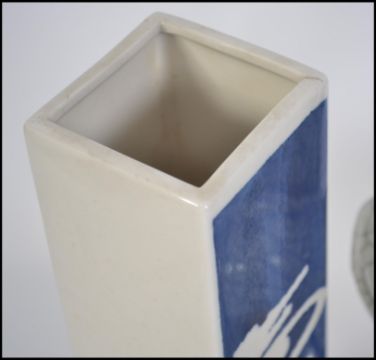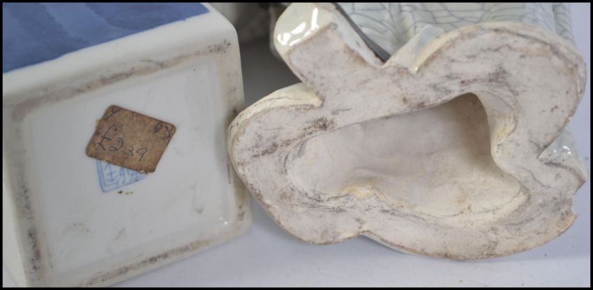 A late 19th century / early 20th century crackle glaze Japanese ceramic figure of a man raised on one leg supporting a bowl together with a vase Chinese / Japanese vase of rectangular upright form having white ground with character marks in blue to the front. Stamped to base. Tallest measures 28cms high.