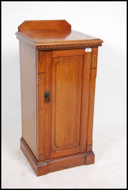 An Edwardian mahogany pot cupboard having a plinth base with locker door having flared top above. Measures 85cms high x 40cms wide x 38cms deep.