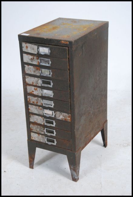 A vintage industrial mid 20th century industrial ten drawer metal filing cabinets, raised on tapered legs.