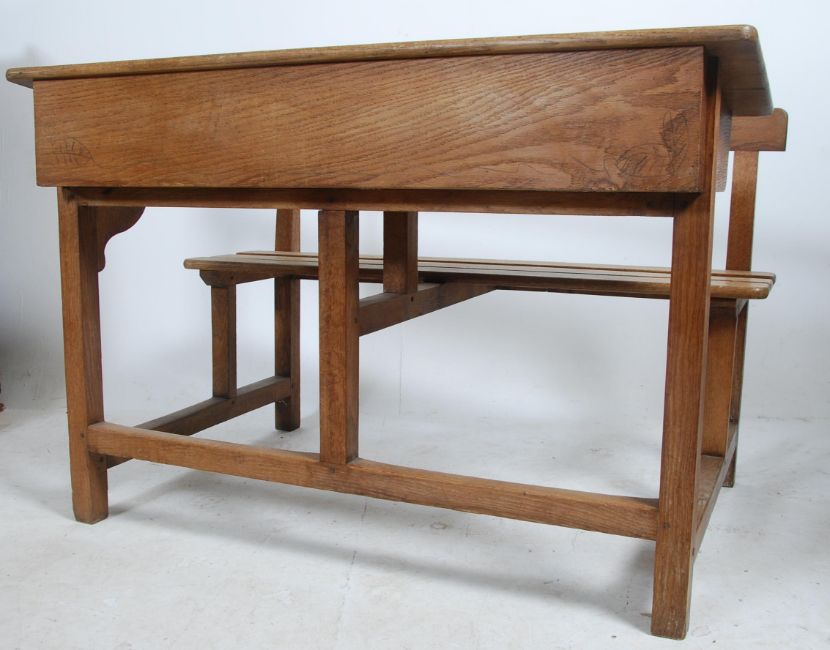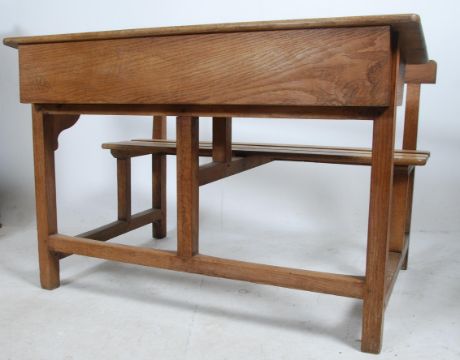 A good vintage 20th century solid oak double school desk having a slatted bench seat with hinged desk tops