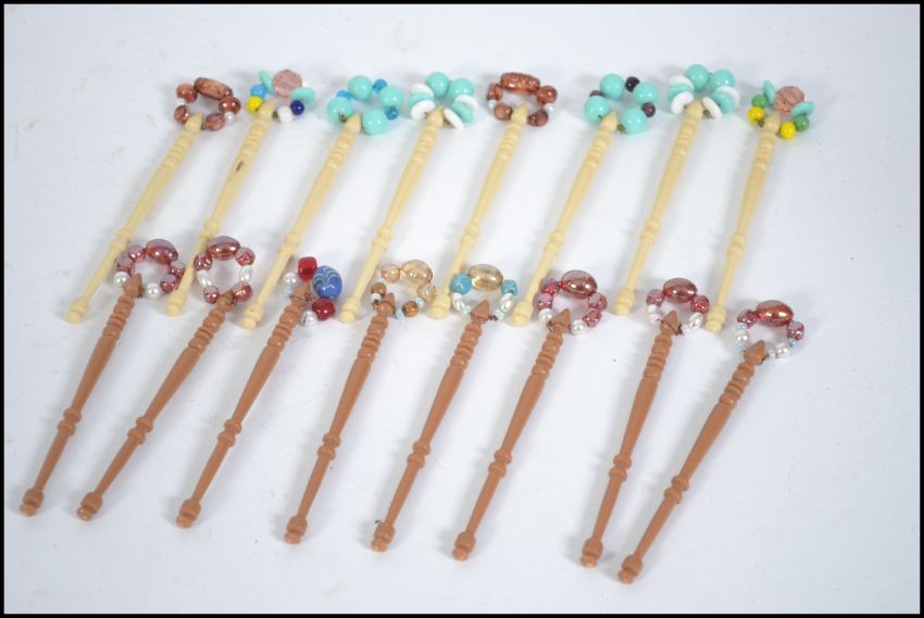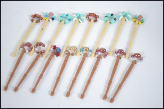 A collection of turned wood lace bobbins, to include examples with inlaid wire, bead and pen work decoration