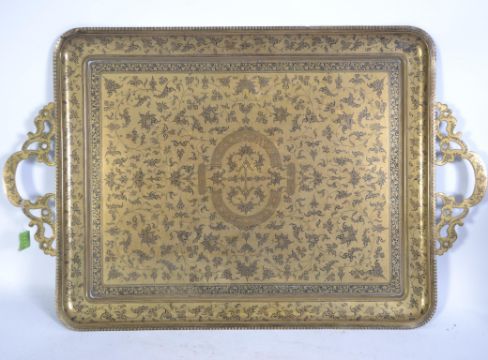 A large finely decorated Moradabad salver tray having twin handles, central medallion with scroll work decoration