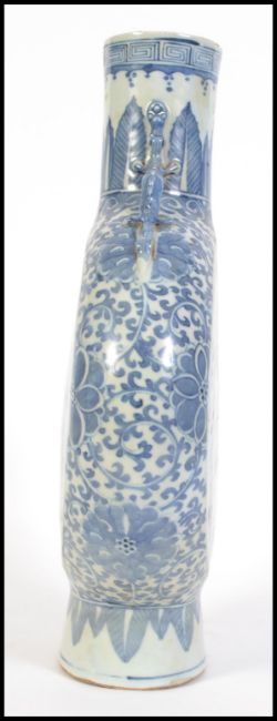 A 19th Century Chinese blue & white porcelain moonflask vase, the cylindrical neck painted with Chinese fret and upright lappets, a pair of well detailed moulded dragon handles descending to shoulders, either side of body painted with a circular panel depicting village and lake scenes. Measures 40.5cm tall.