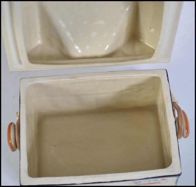 A group of three vintage late 19th / early 20th century ceramic biscuit barrels. Each with lids and handles with examples from Japan and England. Measures 24cms high.