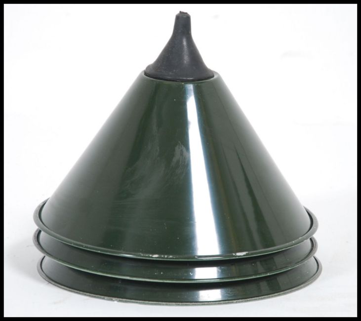 A set of 3 vintage lights enamel painted ex RAF Military metal factory style Industrial pendant shade with rubber fitments. Green painted exterior white interior. Measures 26 x 25cms high