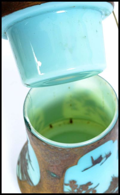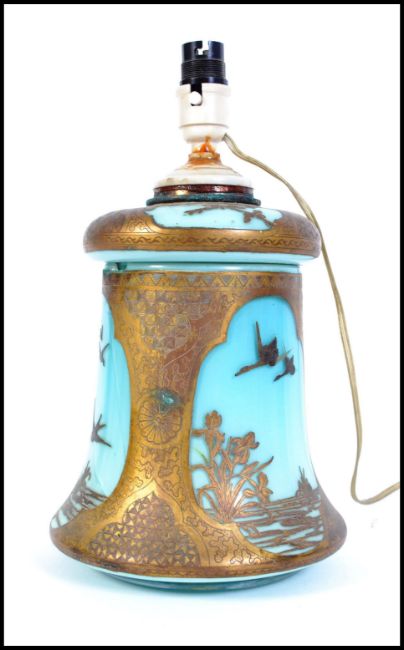 A Victorian aesthetic movement blue glass and brass mounted lamp ( converted oil lamp ) with stunning fret worked brass birds and trees with geometric chase decorating to the mounts. Measures 33cms high.