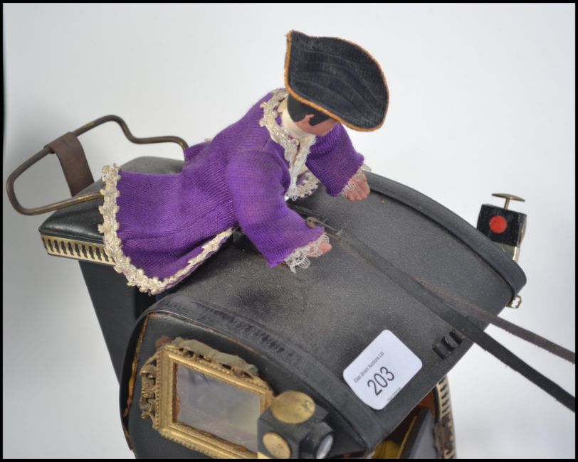 Two 20th century decorative horse and traps both with ceramic horses the first with a lady at the controls and the other with a mounted footman. Please see images. Measures 60cms long.