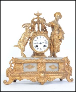 A 19th century alabaster and gilt metal French mantel clock by Vincent et Cie. The case with classical maiden and goat, the 8 day movement clock in cylinder head over alabaster plinth. Measure: 40cms high.