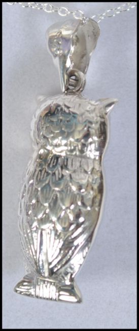 A ladies silver lucky owl pendant necklace and chain, the pendant mounted to a fine linked chain. Total weight 7.1g / Length 44cms