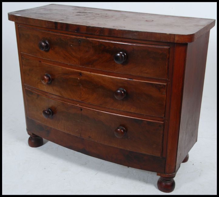 A Victorian mahogany bow front straight 3 chest of drawers being raised on turned legs, the drawers with knob handles and flared top above. Measures: 94cms high x 117cms wide x 52cms deep.