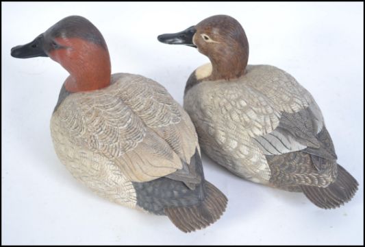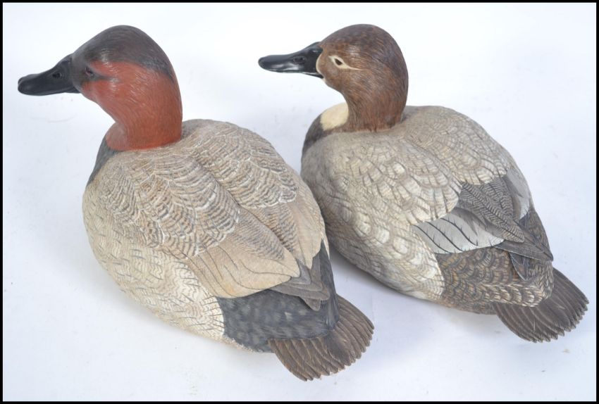 A pair of beautiful hand carved wooden painted ducks / decoy's. Each of exquisite quality and beautifully carved by M. Williams of Newport being part of an extensive collection of wooden crafts, figures and models in this sale. Measures 34cms long.