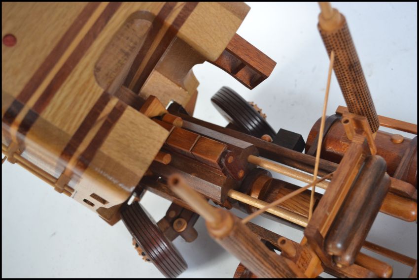 An impressive hand carved and crafted wooden American Lorry being fully articulated with hinged cab revealing engine etc. Beautifully carved by M. Williams of Newport being part of an extensive collection of wooden crafts, figures and models in this sale. Measures 50cms long.